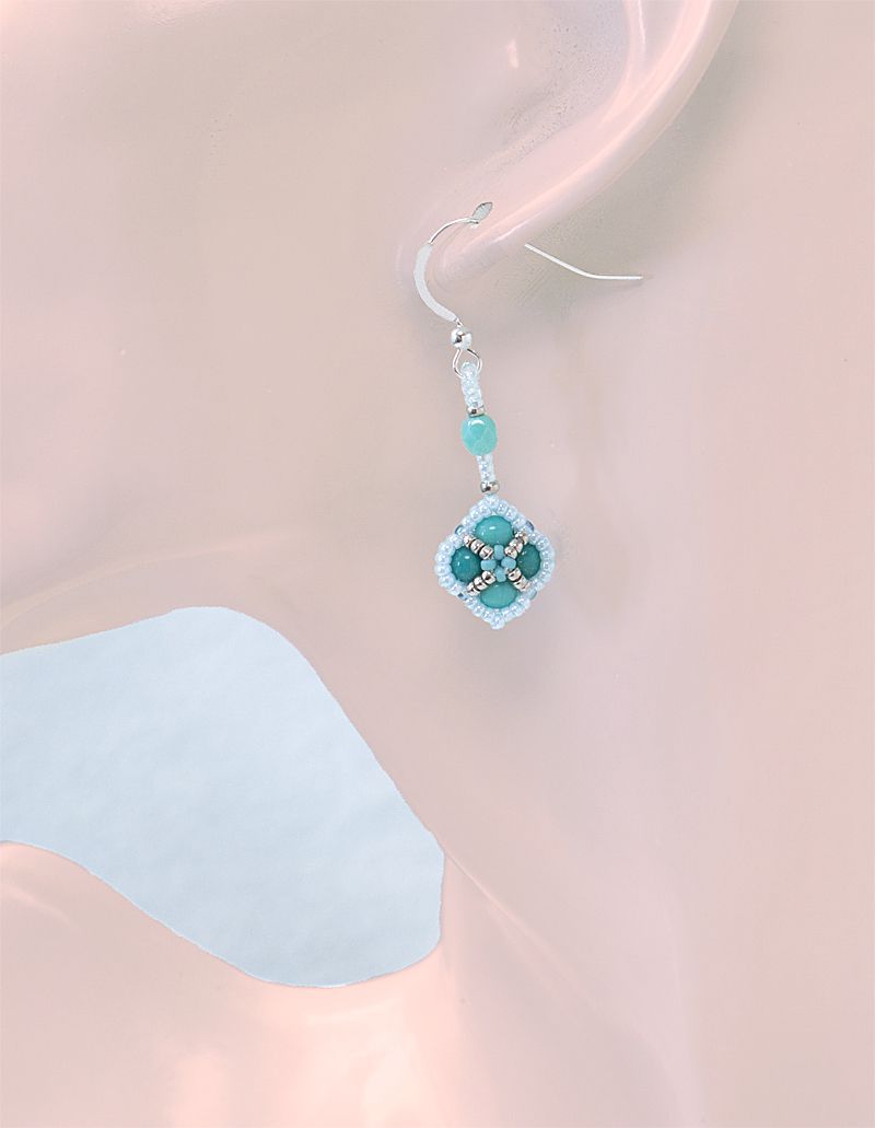 シードビーズ(特小、丸小)、ラウンドビーズ、ロンデルビーズ(アマゾナイト)、留め金具:シルバーコーティングのトグル(マンテル)、糸(Nymo)、作り方説明書
